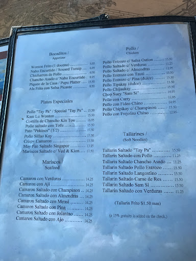 Read moreMonday 06/03/24 - We were excited to visit after having visited in a few years when the food was so good. We ordered Tipakay Chicken, House Special LoMein and my son wanted lomo saltado, plus an order of arroz chaufa (fried rice). We noticed immediately that the fried rice was not fresh, it was re-fried, still good but boy, let's see the rest of the food. Chicken Tipakay is supposed to be breaded chicken a bit crunchy on the outside but this was re-fried chicken not fresh and it was dry through! It was very hard to chew and not nice to taste. The house special lomein was just boiled noodles from a package with sauteed veggies, chicken and shrimp on top. The shrimp, according to my husband, was tasteless. The most interesing dish was my son's. He ordered the lomo saltado, we were suprised it was asian style not criollo style, since we were in a Peruvian-Chinese restaurant, we told him to try it and he did, he only had some pieces of steak which were super seasoned with pepper like trying to cover something and the dish usually is served with fries, which we recognized to be the fries we buy from the frozen isle at Walmart. The check came close to $100, and tip was already included (beware). My husband and I were in such shock for such bad food that was served, that only when the check came, we discussed how bad it was and that it was not worth the amount of money we were paying. Once of the things we discussed was maybe because it is a Monday and it is slow... blah, blah, but literally there's no excuse if you are a restaurant with a good reputation to ruin it by serving old food to Monday customers, it should always be good. There are a lot of new Peruvian restaurants popping up in South Florida and all the way up to Palm Beach, where we actually live, if they keep going like this, they will not have business from anybody. Especially, from the Peruvian community, because guess what, as immigrants we like to enjoy a hard week of work by spending our money for good things not for something that belongs...