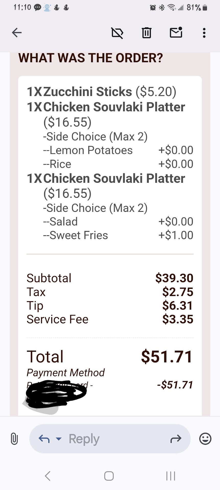 The total bill was $51.70, including a 15% tip—and they made no effort to offer a solution or show even the slightest empathy.