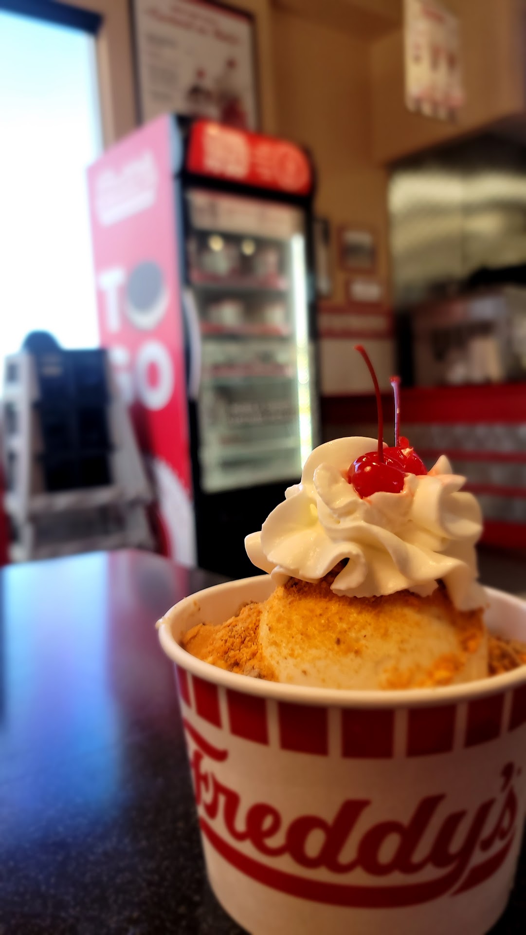 Read moreDuring our first visit to Freddy's Frozen Custard and Steakburgers, we were pleasantly surprised by the welcoming atmosphere and generous hospitality. As newcomers, we received a complimentary custard, setting a positive tone from the start. I opted for the jalapeño double steakburger, while my wife enjoyed the California burger paired with crispy onion rings. Both burgers were flavorful and satisfying, complemented by fries that, while reminiscent of picnic sticks, still offered a good crunch.