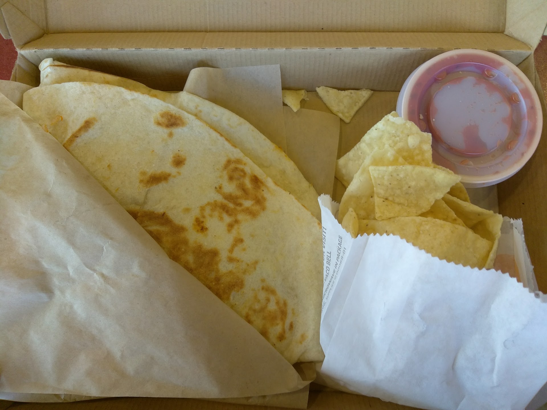 i was thoroughly intrigued by the staff here. They were all nice and polite, but I will say there is a clear difference between the front-counter and the kitchen. Up at the front counter all you hear is "Enjoy your meal" or "Have a nice day!", but when you see them working in the back (the placement makes it very easy for you to see everyone prepping your food, not necessarily good) they don't smile and I didn't even really see them talk. Nonetheless the food here is superb! Of course this is Taco Bell, a fast food restaurant, and my expectations are on a level of that of a fast food restaurant. Comparing it to the other restaurants in the area (Carl's Jr, Jack-In-The-Box, Arby's, KFC, McDonalds, this was some pretty good food. I ordered the Double-Dilla which is now my new favorite item, and when I asked, the register woman kindly let me know that it was absolutely fine for me to substitute the spicy Jalapeno sauce for sour cream. I also ordered a Mountain Dew Freeze, which she didn't mind mixing all the flavors for me, it was the bomb! (The guy at a different Taco Bell told me this was called a 'Twilight Freeze', interesting) The food came out super fast, and it was nicely packaged, with the quesadilla being cut easy enough that I could cleanly rip the segments apart. So cheesy and gooey and delicious! As I was sitting analyzing the restaurant for this review, I noticed the counter-clerk had begun to clean the dining room (they weren't busy), and she went around asking folks how the food was, and if there was anything else she could get them! That kind of customer service is not usually given in a Taco Bell, so I was awestruck. She gave them a polite conversation (it was an actually family that came in the middle of the day to eat Taco Bell, which was a bit weird to me) before zipping back up to the counter and apologizing to the next guests for their wait (which wasn't long at all). Nonetheless, this was a great example of how every Taco Bell (and fast food place in general) should be: speedy food, great customer service, and polite team members, Taco Bell is now my new favorite fast food place, but again, this review is given on a scale of fast food restaurants, not...