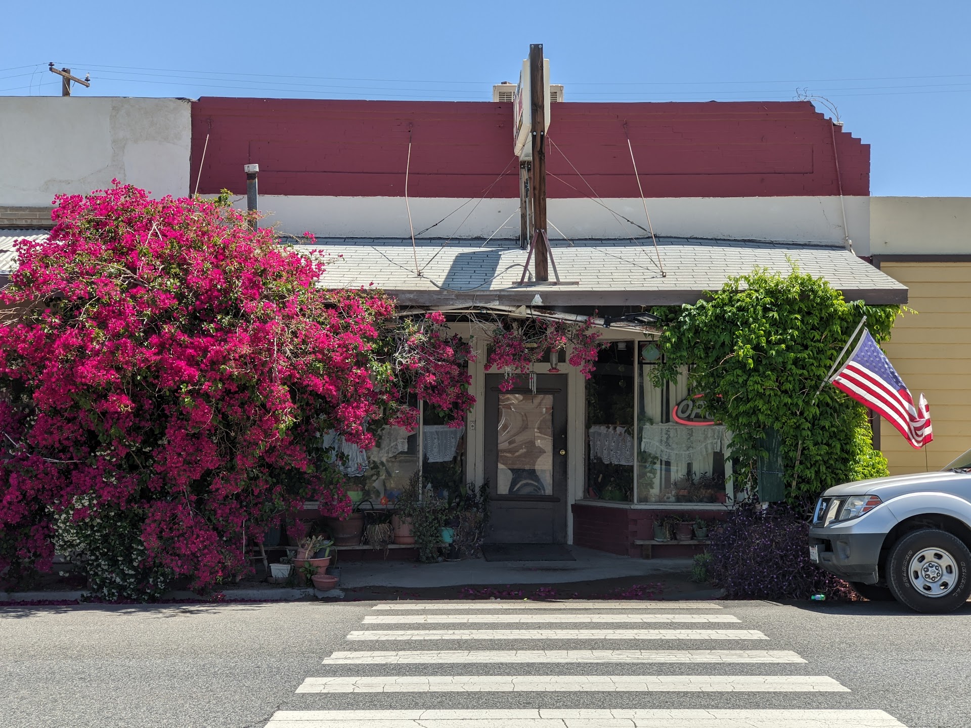 This place is pure adventure perfect after venturing through the wilderness. LOL Probably the closest food to Carizzo Plains and it is worth a visit. Tina is a delightfully charming woman who does all of the work - she hosts, waits tables, cooks, busses tables, cashiers, all of it. It would be very easy to run away aghast at the state of the run-down restaurant, but if you just give it a chance, you'll realize that's what makes it perfect. From the grainy splotched paper ink-jet printed menus consisting of mobile-phone photos of an old physical menu held by a disembodied hand, to a very thrilling trip to the restroom through dark caves and indiana-jones-esque temples of restuarant supplies and refuse, the experience is going to be the cherry on the cake of your Carizzo plains adventure. After Tina takes your order you'll need patience because again, this is a one-woman show - and show it is - The sound of Tina's charming soprano singing voice wafts out of the kitchen as she serenades the food she is cooking for you. We were there after our adventurous trip through the flowers and it seamed the 9 other people there were also there because it was all they could find nearby after their trip through Carizzo. The food is definitely "Greasy Spoon" finer fare and the portions are enormous and the prices are low. When your food arrives, Tina's charm and wit lights up the dining room and she'll playfully tease you about anything she can think of. The decor and atmosphere is frantic and from another time. Enormous hand panted murals adorn the walls above your heads that surely pay tribute to the surrounding town and environment, but who's narratives are not entirely clear. One features the words "Maricopa, gateway to the..." above a beautiful mural of the sea with ships bobbing on the waves. (Maricopa is a land locked desert town, 3 hours from the nearest shore.) I'm sure there is an explanation lost to time. Framed art of angels and Jesus blessing the cast of Finding Nemo fill in the space on the walls and there are enormous vines of live plants and flashy clocks that strike the hour, and a unsettling life sized child doll guarding a missing bar stool post. The coffee creamer (powder) bottles on the table were faded and at least a decade old (cleaned and refilled, certainly), and I'm not sure any of the bar seats are open for customers because business supplies live on the bar. Your food is delivered to your table via a silver cart pushed by Tina and her loving song and smile.