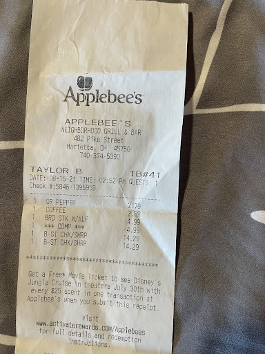 I have been to a lot of Applebee's, and when I say a lot, I mean more than 10 over the last 5/6 years. Being in traveling for work family, I've lived all over the east coast. When we decided to settle down I was happy we chose Marietta, smaller town, it was more calm than what I was used too. With Covid being as bad as it is, I hadn't been to a restaurant in almost 7 months. I was so sick and tired of fast food so I decided to go to this location. I was worried about the social distance and the safety, let me tell you, this place has it down. It's like they have been doing it all along. The service was great, they practiced social distancing, the waitresses all wore clean gloves that I saw them change between tables, all were wearing masks, all of them were standing six feet from the tables. The customers wore masks when they moved from their tables to leave, come in or go to the restroom. No one was seated around us within a six foot radius. I would like to think all restaurants have been doing this, but this place is clearly doing probably the best. It was great. I didn't go at a busy time, I went when they first opened at eleven and eventually some people trickled in, but I counted, only two people walked past our table. A waitress and another server, and both of them had been wearing masks and practicing social distancing. Now, the food. Oh my goodness. Everything was hot, fresh, flavorful, our waitress was so kind and so attentive, my drink never got empty, she always brought a new glass before I even had to ask. I'm honestly so impressed. I'll be back in the...