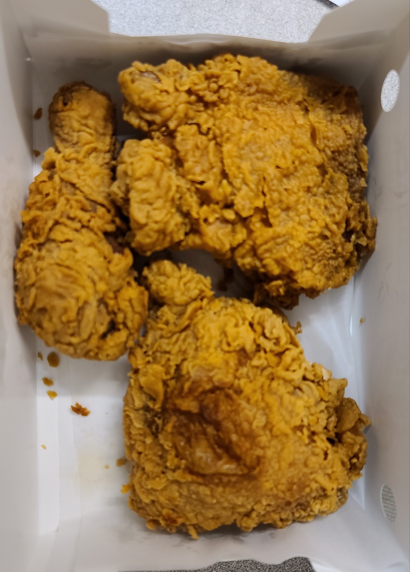Heads up. If you're pressed for time you may want to choose another place. The food was ok. Nice and hot temperature wise. A bit too crunchy for my liking today. If it weren't for the fact I usually enjoy any chicken I'd probably had rated here a 1 â.