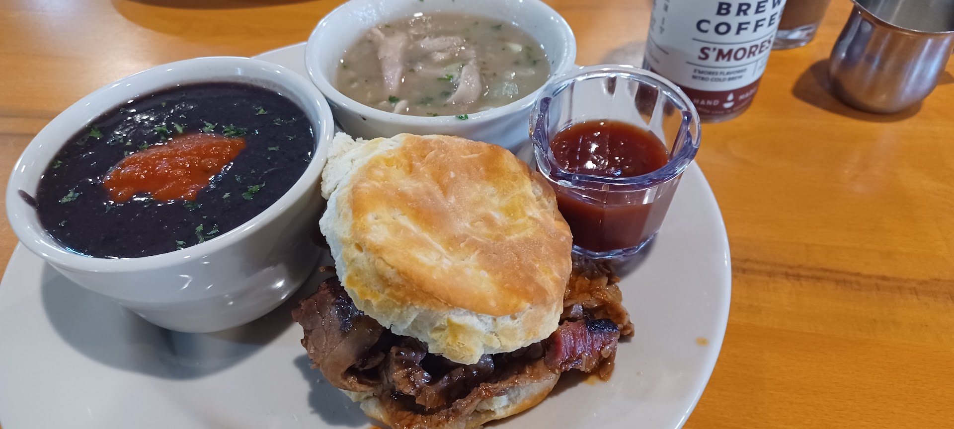 Came here for a quick bite and wanted to try out the brisket. I got a brisket biscuit, a cup of black bean soup, and a side of the chicken gravy. The waitress brought out a little plate with 2 house made jellies, strawberry and mango, and mentioned they were for the biscuit. When the food came out, there was a side of BBQ sauce. I was then confused when I opened the biscuit to try the brisket first without the sauce, only to find it alresdt drenched in sauce. The sauce had even soaked into both sides of the biscuit, so I wasn't sure how I was supposed to try the biscuit with the jelly. The BBQ sauce was sweet and vinegary, which was good, but it masked and overpowered any flavor that was smoked into the meat. The brisket was nice and tender and juicy. I tried the jellies on their own, and both were good and not overly sweet. I ate the brisket separately and then tried the smoked chicken gravy on the biscuit. The "gravy" was good, but it was more like chicken soup and thin and watery. Not what you think when you hear gravy. The black bean soup was really good. The salsa puree on top when mixed in was perfect.