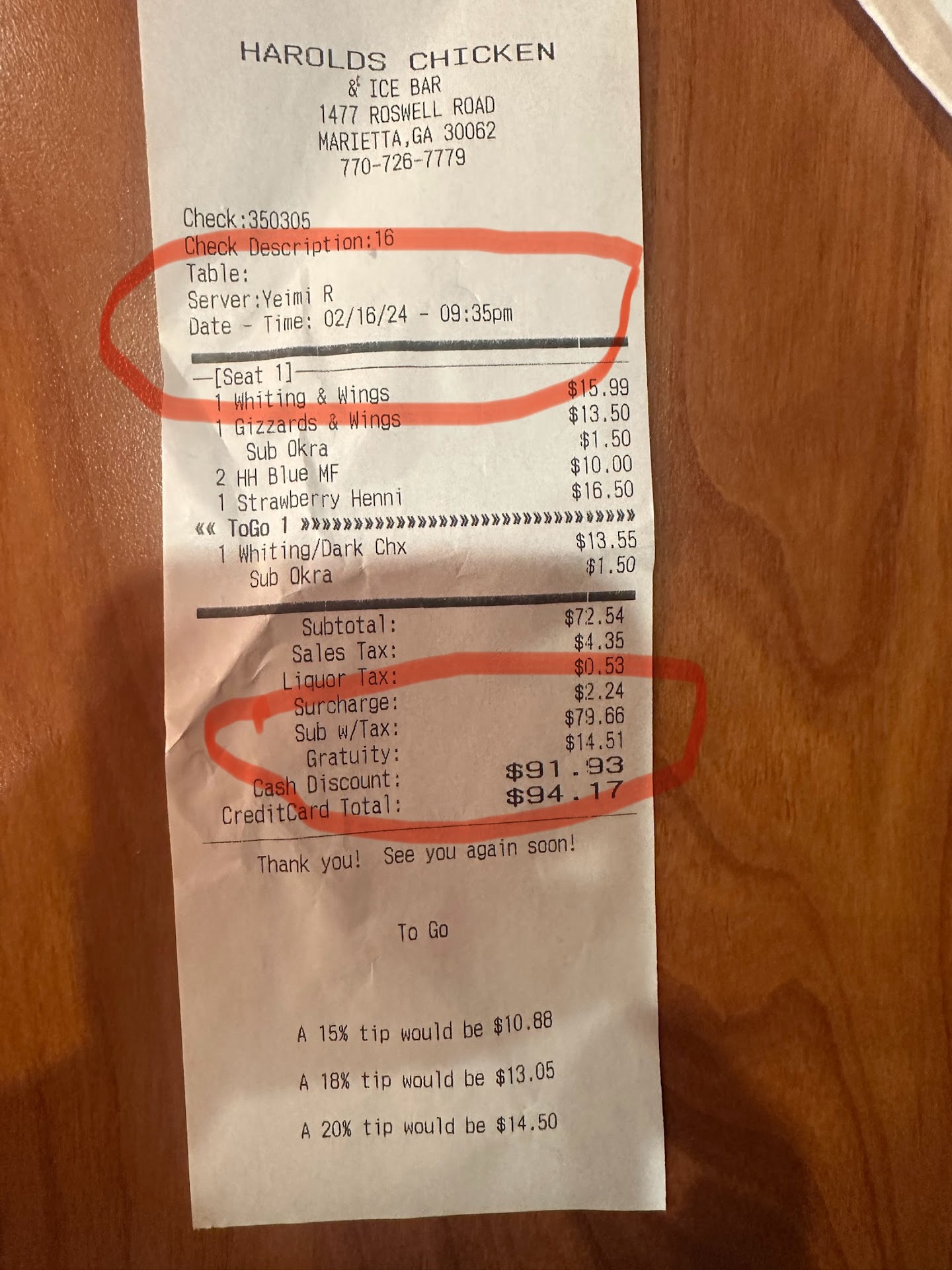 Read moreif i could give zero stars, i 100% would. our server was pretty inattentive off rip. she didn’t offer any type of menus or really any type of help beyond asking us what we wanted to drink. she checked on us once the entire time we had our food. i had to get up and go hunt her down to get our tabs closed! asked the bartender for the HOUSE margarita, and specified i wanted the $6.50 one. she read off liquor options when i asked what they were (for the $6.50 margarita) and charged me $17.50. i would understand this, but A) i asked for the cheaper margarita; top shelves are listed at $13.50. where would an extra $4 surcharge come from? B) instead of attempting to come to a solution, she kept insisting there was nothing she could do. not to mention, when i tried to communicate this with the bartender, she refused to listen to me OR my companion and kept repeating the same five sentences. i am a server, and actually work near harold’s. if you have auto-gratuity, you have to let the customers know. posting a tiny sign and posting the message in small printing on the menu is deceptive and disgusting. they up and overcharge like nobody’s business. seems like the only thing this establishment wants is money! they offered me no other reimbursement beyond a free margarita. you guys refuse to accommodate for customers whatsoever and have the gall to call yourselves a business? i hate that i’m so disappointed because i was so excited to find and try a black owned business near me as a black woman. i was expecting so much fun and a great experience, and instead harold’s lost two patrons that were just looking for a drink and a good bite to eat. spend your hard earned money elsewhere instead of getting horrible...