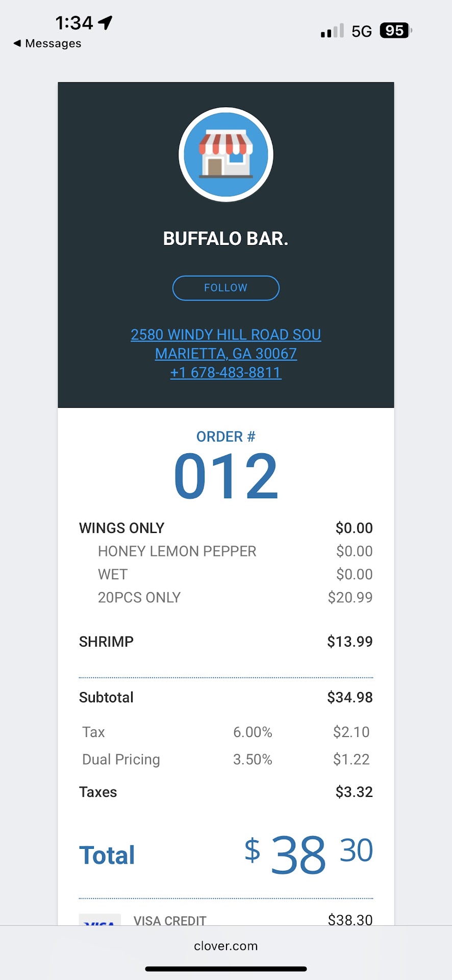 On 5/24/25, I had a bad experience at this location and it was because of the short Hispanic woman who identified herself as the manager. She was very argumentative over the phone when I attempted to place the same order that I order everytime that I visit J buffalo bar on windy hill rd . Hereās how it went down. I called at 12:54pm, the phone rang 16x and then she picked up. She immediately put me on hold and after I acknowledged it, she disconnected the line. I called a second time and the phone rang 18X before she picked up., didnāt say anything , and then hung up. The third time she answered after 6 rings, she asked what would I like to order, I told her I would like 10 wings, honey lemon pepper, and an order of hibachi shrimp fried rice. After saying all that, the manager asked me if I wanted rice with the vegetables and unions(hibachi, she obviously wasnāt listening) included and I said yes. She immediately started explaining to me that they donāt make orders like that and that the person who took my orders in the past was doing it wrong . After going back and forth with her about how I normally eat the same meal and that she didnāt know what she was talking about, I then told her that I was 5 mins away and that I have a receipt from my last visit and I will show her when I get there. When I arrived I saw her and asked her to explain what she meant by not making orders for wings and hibachi shrimp fried rice and she reiterated that they donāt do those orders. She also emphasized that she was the manager. (I have never seen here before after coming there over 2 years now) I then showed her a digital copy of the reciept from my last visit that showed both orders. Instead of taking full accountability of her mistake, she tried to say I told her that I wanted regular shrimp fried rice (even though I confirmed i wanted hibachi rice over the phone and she was arguing the fact) . This was after I pointed out she thought was trying to order the meal that added $5 more for the regular shrimp fried rice. I tried to explain to her that as a manager, itās inexcusable for her to argue with a customer, especially one that comes there regularly, and that I had my whole family in the car that wanted to go eat somewhere else after they heard how she behaved on the phone . Normally when the food is complete, the person who takes your order opens up the plate To show you what your food looks like. Today, that didnāt happen. The MANAGER just handed me the bag, maybe because she felt shame in front of the other customers in the restaurant who had to hear me confront her about her bad behavior . In the end , I ended up ordering less food that I normally ordered just to prove a point and placed another order from another wings spot for the rest of my family to eat right in front of her after paying for my order. Iāve attached the receipts from my previous visit to reflect my point and todayās receipts from both restaurants. This individual who claims to be a manager needs customer service training and an attitude adjustment . If Angle doesnāt get her act together, this location is gonna start seeing more reviews like this and you will lost more customers like me. I generally spend between $35-$50 when I eat here. That didnāt happen today and itās because of the MANAGER, ANGLE!