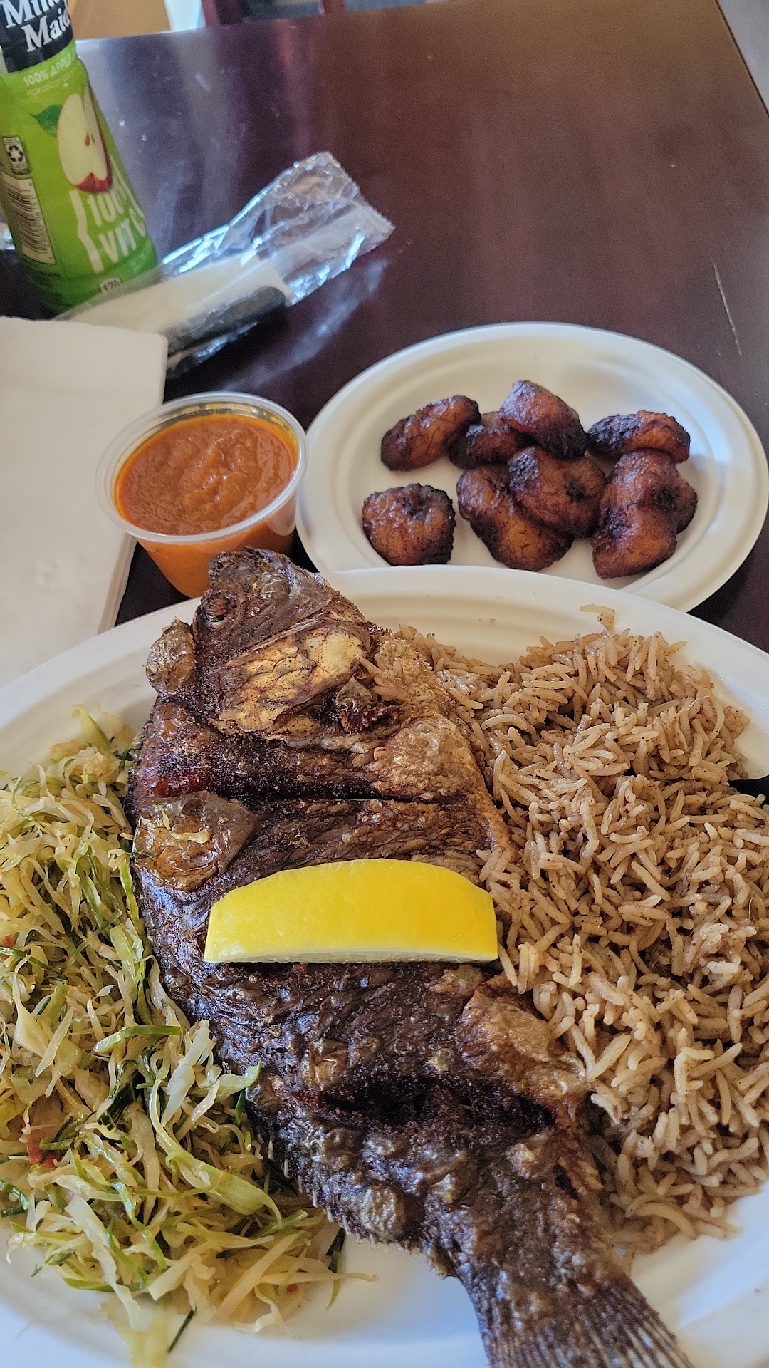 Read moreWow..my wife has DEFINITELY been gatekeeping this place from me. She told me over and over about Jambo but she never brought any food back home. Marital problems aside, this place is delicious. I knew I was in the right place when I walked in and smelled all the seasonings. That put my trepidation at ease. When I ordered the samosas, I noticed that they didn't have a dipping sauce or chutney to go with them. Instead I was offered a lemon slice. The husband explained that this was more traditional.When I tasted them, I immediately understood the assignment. They were the best samosas I've ever eaten!!!! They honestly didn't need a sauce with all that flavor. They come in beef or chicken. My wife and I got two orders to go but I digress. My wife and I both had the whole tilapia with sides ranging from greens, cabbage, to plantains. We are everything down to the fish head. Absolutely delicious! You can tell that husband and wife duo really has a passion for what they do. I spoke to both of them at great length afterwards to get a little bit more of their story and they are both so gracious and humble. I really enjoyed the whole experience from start to finish. There's a certain intimacy about the place. It's like I visited someone's house to get something homemade. We even got extra chapati for the trip home. Honestly as I write this review... I'm planning my...