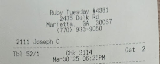 Ruby Tuesday's location at 2435 Delk Rd, Marietta GA Sunday Dinner, 6pm on March 30th, 2025