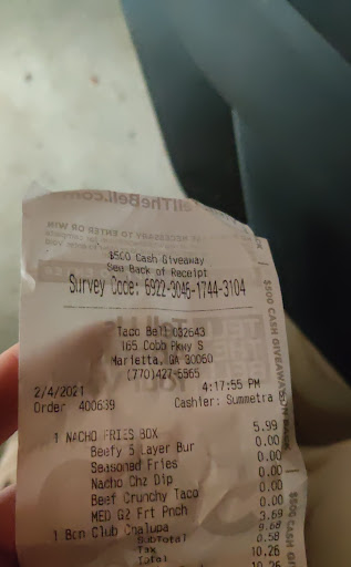 Read moreOne car was in front of me and the had already ordered. Got up to the box and a male asked me to wait. He must of forgot to mute his headset as he was heard getting short with his employees so it must have been the manager (Feb 4, 2021 around 4:30 pm). Summetra finally took my order of Nacho fries box and the bacon chalupa which I wanted to try. Waited for about 5 minutes and the person in front of me must of got tired of waiting because they drove off without their food. My turn took 5 more minutes as they asked me to pull up (probably to make their drive thru times look better). I noticed other people got their food and I was left out as if forgotten. Finally after listening to two songs on the radio, I had enough. Went inside and everyone hurried to pull their masks up when they noticed someone actually came in. The manager told me the wait was for fresh fries but yet when the box was opened the fries were cold. Plus fries take 3:20 to fry and how was others getting their food? When this was pointed out the manager didn't own up to a mistake being made and apologize but got defensive. He went as far to offer me free items but in a way that was implying that is what my intentions were, which is far from the truth as a sincere apology was all that was wanted. I left the food which was paid for on the counter and didn't get to try the new chalupa. His lack of responsibility, obvious lying, and poor management was disappointing. Real men and leaders own up to their mistakes, learn from them, and get better. Hopefully he takes this approach one day and becomes a better person. This review is an attempt to maybe instigate that approach and...