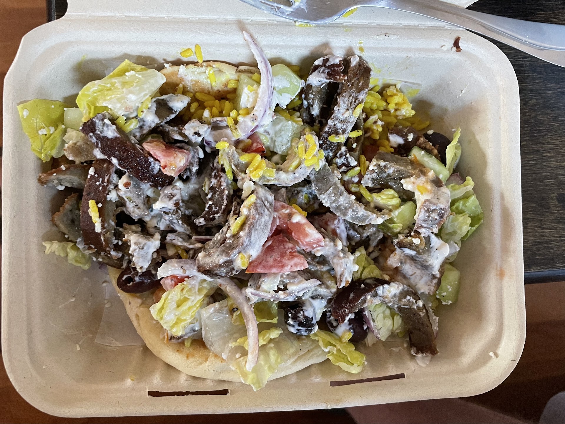 I ordered a basic dish, Gyros (not a plate, a pita wrap). You’re supposed to be able to pick it up and eat it. As you can see in the picture, that was pretty much impossible. They basically turned my gyro sandwich into a gyro bowl. The meat was overcooked, and cold. The lettuce definitely came from a bag. Veggies didn’t seem fresh at all, and the pita bread was very stale. The rice was probably one of the only decent things about the dish. The sauce portions were definitely not adequate for the amount of food you get. All in all, very stale, with little effort put into the presentation of the food. Also, food was very difficult to eat as it was improperly assembled.
