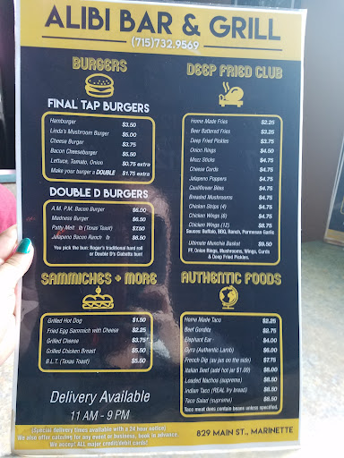 This place has amazing food. I've never had anything there that wasn't delicious and everyone I've ever talked to about it say the same. The food is very reasonably priced, you couldn't get a gourmet burger at Hardee's for thr price of the burgers at The Alibi. The reason I'm writing this is because of the Madness Burger I had for lunch today. It was a thick quality beef patty topped with deep fried cheese curds and deep fried pickles. It was ridiculously good! You can taste the quality of the fresh ingredients used to craft all their food. You will not leave there disappointed, the owner will ensure that. He is an intelligent savvy business owner who ensures his customers leave his establishment happy, he actually cares and is there for his guests, it's basically a satisfaction garauntee. You pay extra for fries just as you would at any fast food restaurant, the difference being , the beer battered fries are hands down the best fries in town. You taste the quality ingredients and freshness in every plate crafted there, NEVER had a bad meal. If I had to choose only 2 items to recommend, I'd say get the Indian Taco or ANY burger............... and don't even get me started on the gyro meat. Gotta go, my brothers pulling up with a late night snack from The Alibi. We got a Pizza, Deep Fried Pickles and an Elephant Ear. Best munchies in...