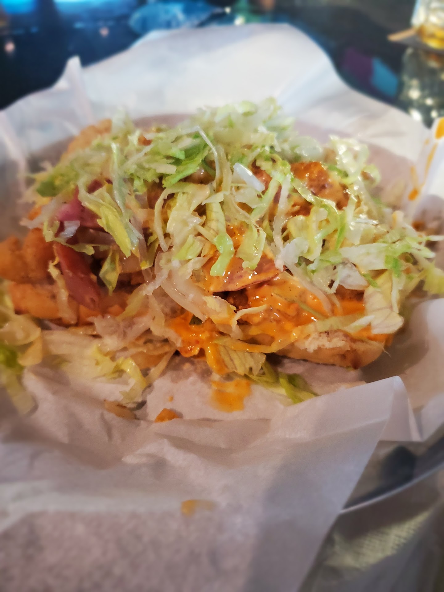For my dish, I chose the Bad Boy Po-Boy sandwich. Kielbasa sausage, fried shrimp, lettuce, tomato, peppers, onions, on a hoagie roll. Absolutely amazing! The side of tator tots was a wonderful choice, and probably the best I've...