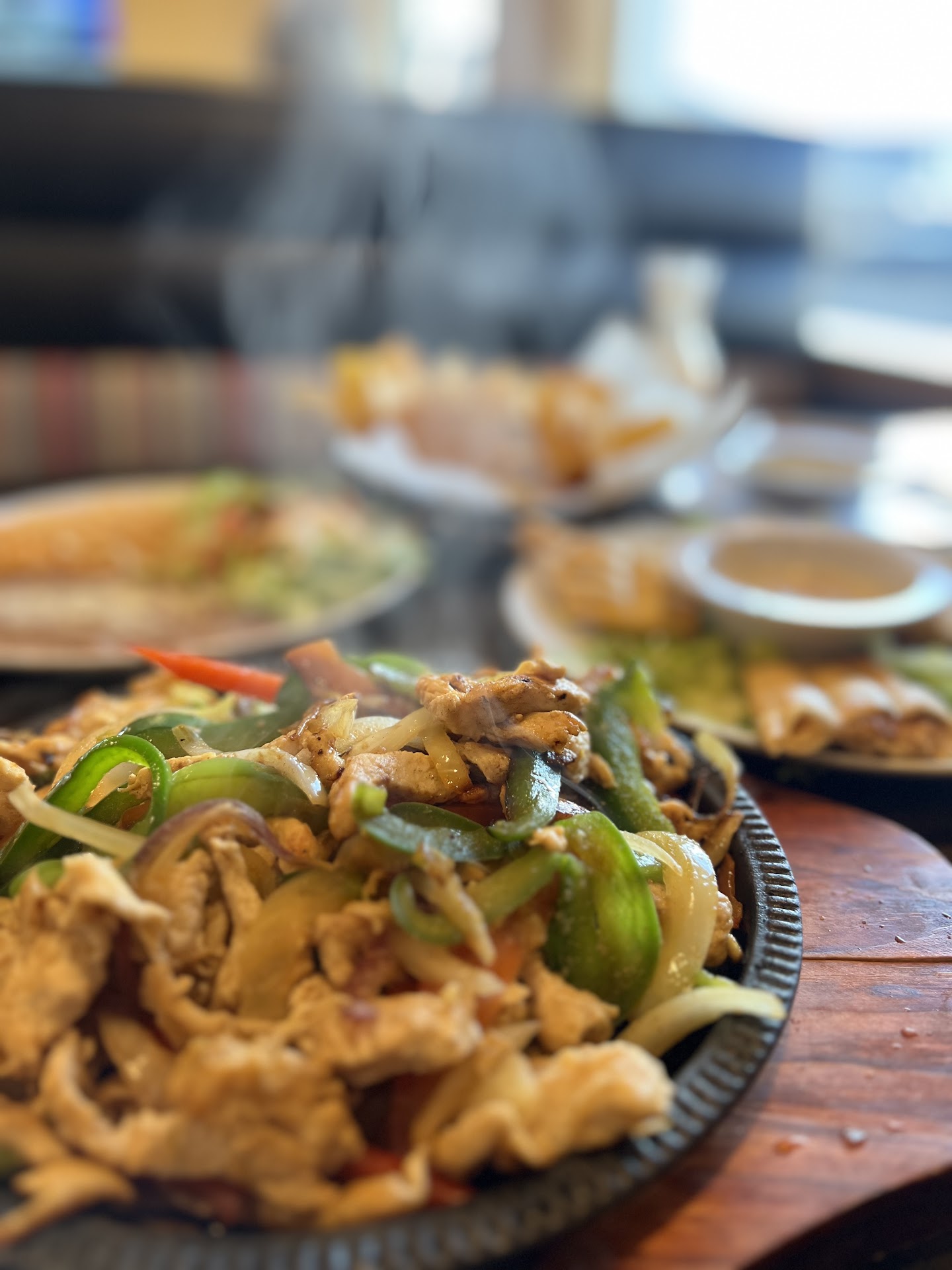 To start, I ordered the Mini Chimis (Two fried chimis stuffed with chicken, beans, and cheese and served with a homemade dressing.) The dressing was something like a coleslaw, sweet and tangy, and I could have probably drank the stuff it was so good. The chimis were cut in half and served over a shredded lettuce bed and were cooked perfectly. had to move the plate to the back of the table so I would not just eat all of it right then and there and not be able to eat any of the chicken fajitas I had ordered for an entree.