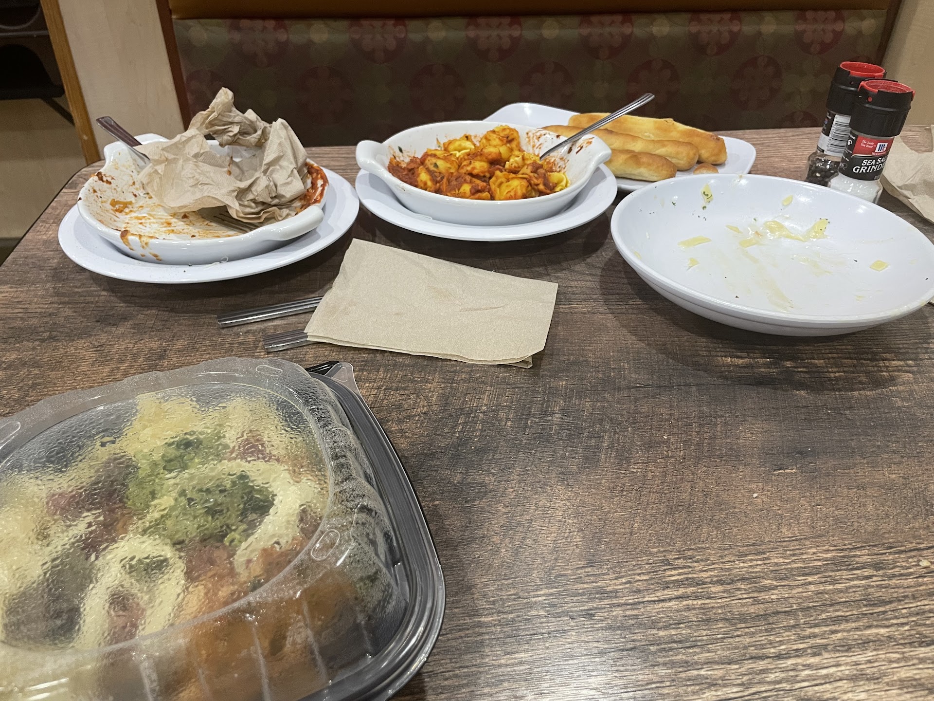 The first tray of food was brought to our table, and now looking back, I think it belonged to another table, but the delivery was so poorly handled we wouldn't have known at the time. The same gentleman who took our order was bringing the food out. He got to the table, and started asking who had what, but was using very general terms - "Who got the lasagna?", " who got the alfredo?", and "who got the #9?". All of us, not being intimately aquatinted with the menu, asked clarifying questions, and we were a big group who - to our discredit - were not all paying immediate attention, but this encounter ended with the man putting the last item - a #9 baked lasagna - on the table and saying "well someone ordered the baked lasagna". In fact, no one at our table ordered the baked lasagna (back to my original statement that I don't think we got our order...).