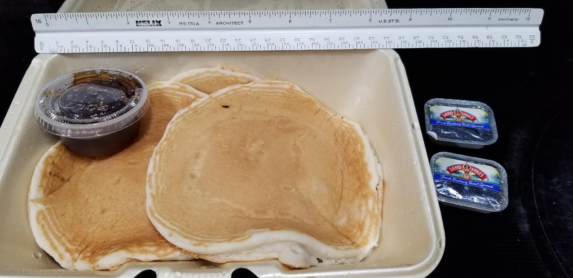 The pancakes were overcooked (hard to cut) but paired with their syrup encouraged us to finish them off.