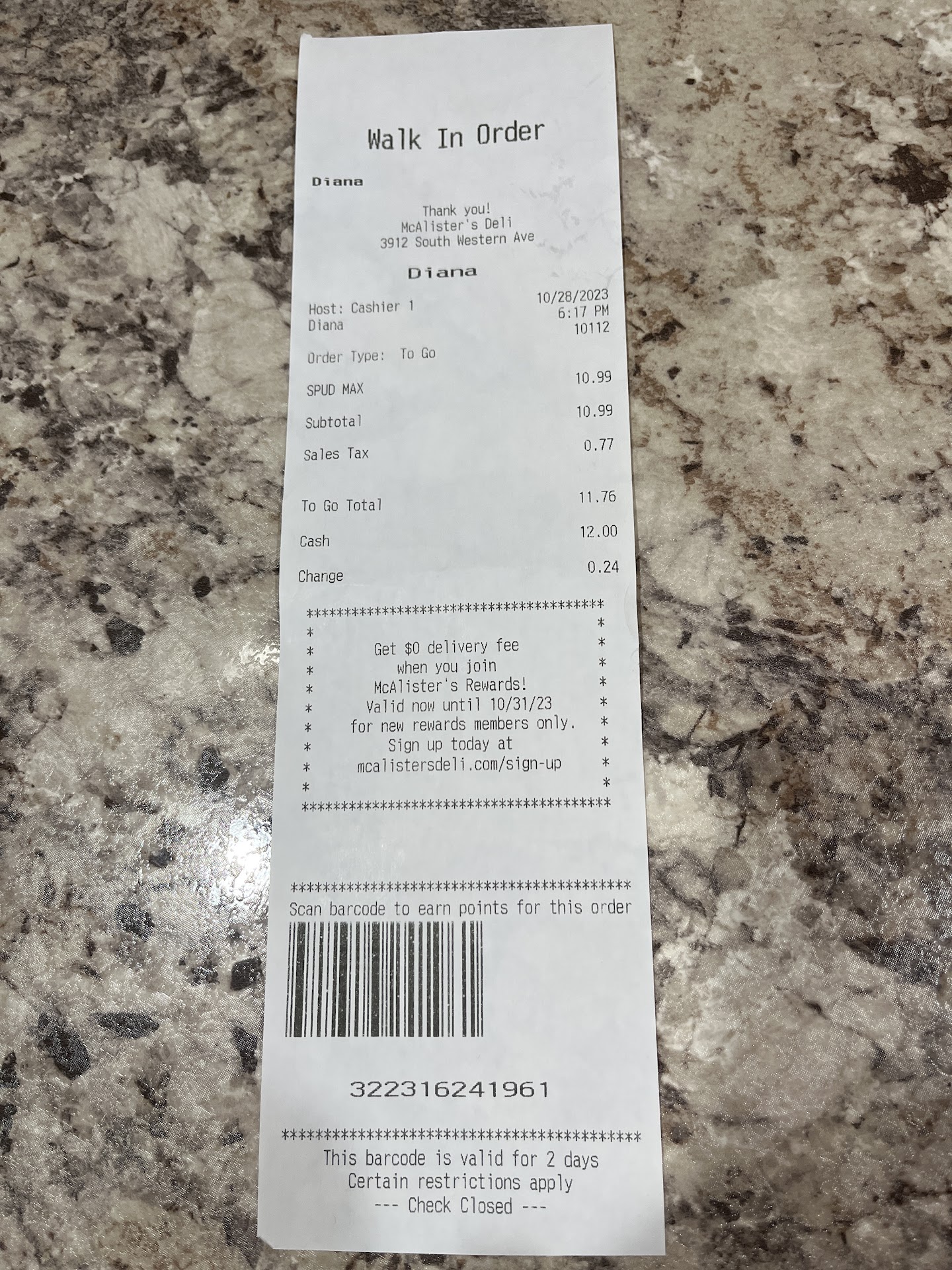 They don't have their tumblers for sale at this location (at this time at least) but they honored the discounted refill price when we brought ours in which was great - definitely makes getting their "famous" tea easier on the pocketbook. Unlike the other McAlister's we sometimes go to, this has a self-serve ice tea station which I like since I like just a splash of sweet tea in my unsweet tea... They definitely have good iced tea.