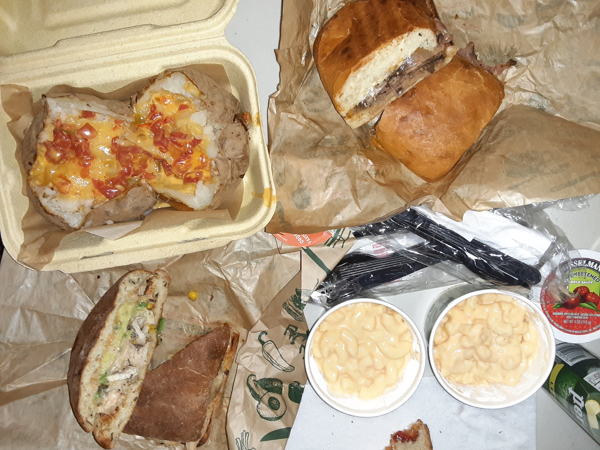 Read moreWe luckily got there before the line was to the door and even went out the door a few times. People were having to sit at tables with dirty dishes on them. Not enough people to run food. There is definitely room for improvement as to how the restraunt functions which would improve customer experience and satisfaction. The sign said once you get her relax but that was not the case. It also said need a refill or anything let us get that. I never saw any staff refill drinks. I needed butterand sour cream for my baked potato I got up to get it, not a big deal it just goes agaisnt what they advertise. Also, why are they asking for tips to make a sandwich that i order at the counter? Subway doesnt do that. Now if you had a hostess at the front door seating staff providing menus and had waitresses taking orders refilling drinks, and had busers cleaning tables, as well as people running food I will gladly provide tips, which we do at 20% at any other restaurant that provides this type of service. Also, instead of order ahead why not have full drive through service?!? Otherwise food...