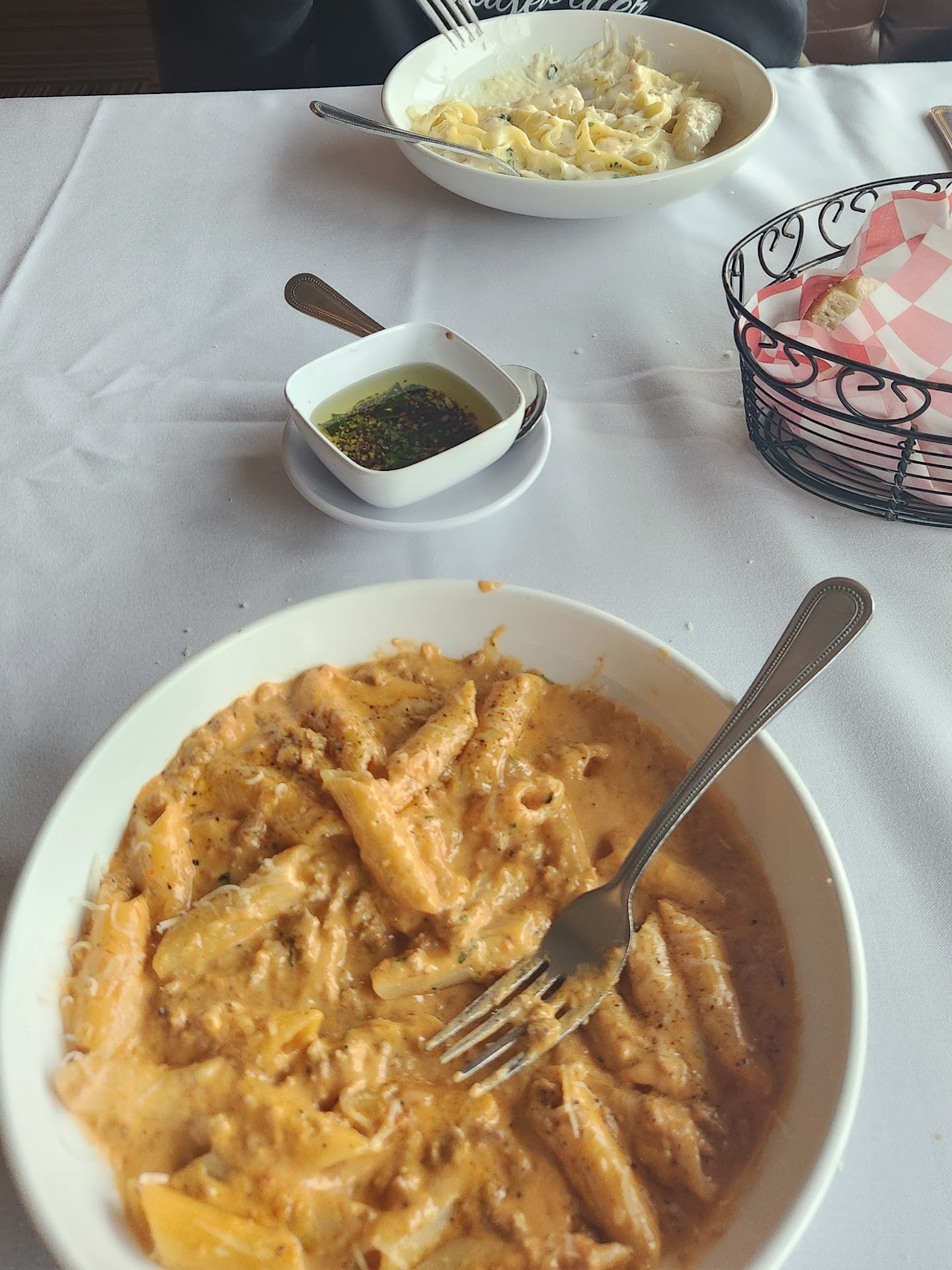 Regarding our food, we are thoroughly impressed and satisfied. From the first taste of the tomato basil soup to the last bites of tiramisu and lemon cake we were able to devour, everything was wonderful. I had the ravioli special with 4 types of ravioli, shrimp, and scallops. The lobster ravioli, spinach ravioli, and portobella ravioli were highlights. The sauce was perfection. My wife had tour of Italy: Lasagna, chicken parmigiana, and fettuccine Alfredo. The ONLY weakness in the entire experience was the fettucine. Even that, we rated at B+. It needed a little more seasoning: garlic and fresh parsley would have knocked it out of the park.