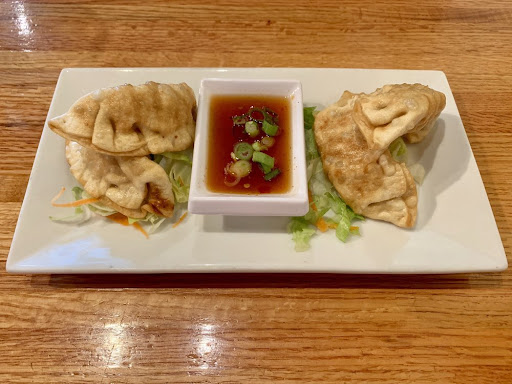 We got the meat-filled potstickers, but a vegetarian option is available. For the price, I felt the portion size could have been a bit larger - only four potstickers were served. We also definitely needed more soy dipping sauce. This sauce had green onions on top, which was an interesting addition. Overall, the flavor was pretty good, but it was lacking a bit of crispness in the thicker parts of the potstickers.