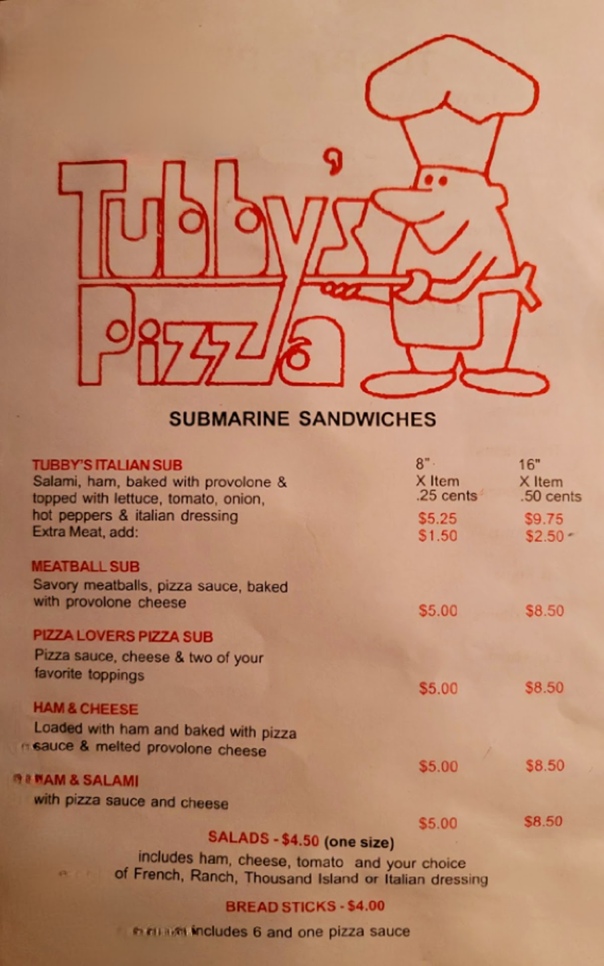 If you're looking for old fashioned thin, cracker crust pizza with a slightly sweet sauce, the usual meats, and diced vegetable toppings, this is where you go. It's a favorite in our town. ▪︎ HOURS: Mon-Sat: 4:00 p.m-Midnight. Sundays: 4:00 p.m.-11:00 p.m. ▪︎ No frills building. Former KFC. ▪︎ Locally Veteran owned & operated. ▪︎ The food is ready in 15 min. ▪︎ Cash only (No checks anymore). ▪︎ They don't advertise (They don't need to). ▪︎ They don't deliver (They don't need to). ▪︎ They don't have specials or coupons (Again, they don't need to). ▪︎ Ballreich chips available. ▪︎ Serve yourself cooler with pop. ▪︎ Pop vending machines (Yes, I said "Pop" because we're in the Midwest) on the outside of the building. ▪︎ Open 7 days a week and even on holidays. ▪︎ Bulletin board with local posts. ▪︎ Friendly customers, always opening the door for other customers with stacks of pizzas heading out the door to privately sneak a couple squares of pizza before throwing the car in reverse and heading home/party/date/church or anywhere where they want to become instantly popular because hey, they've got TUBBY'S PIZZA!