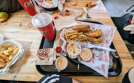 The food was made within 5 minutes, and I was on my way and out the door. Once I opened the box the food came in, everything was well layed out and not sloppy. I then began by trying the chicken tender. Yes, it was crispy, the chicken was moiste, but... It lacked some flavor and seasoning. I dipped it in their famous sauce, and it gave it some flavor, but I was not impressed. I then tried a bite of their fries, which, were kind of droopy and very salty. I sipped up my tea very quick because of that, but it wasn't special eaither.