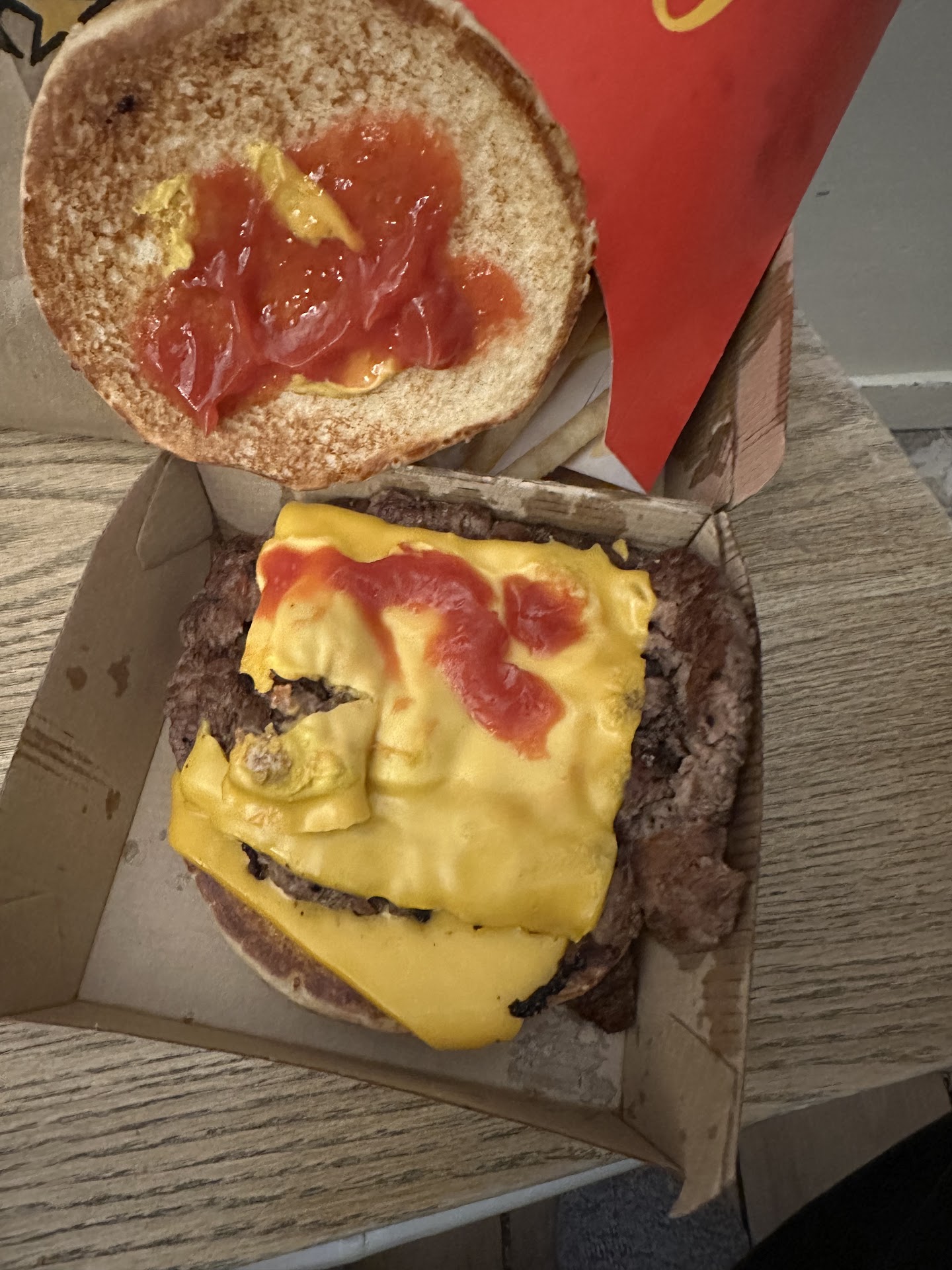 Regardless of the time of day anymore the fries are always cold and stale. The final straw is just the overall messy and low quality of the preparation. Burgers are smashed, sauce splattering outside the bun, or meat completely off the side of the sandwich (see picture from my meal tonight). They also constantly forget stuff- like tonight- they forgot to give me my sauce for nuggets. Super frustrating to get home and find my bag empty.