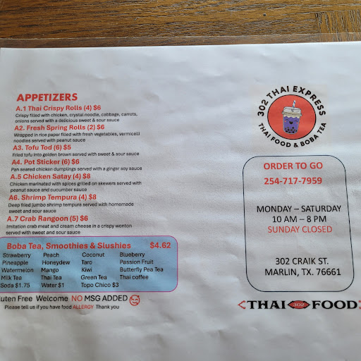 Read moreThis is a hidden gem in Marlin! The place is very clean, owners friendly and sweet, and the food was cooked to perfection! We love Thai food and will return often! We had the Ginger Pad and Pad See Ew and both were seasoned wonderfully. The chicken satay and the sauces that accompany it were sooooooo good! My daughter also had a watermelon Boba that she loved. Go see them, you...