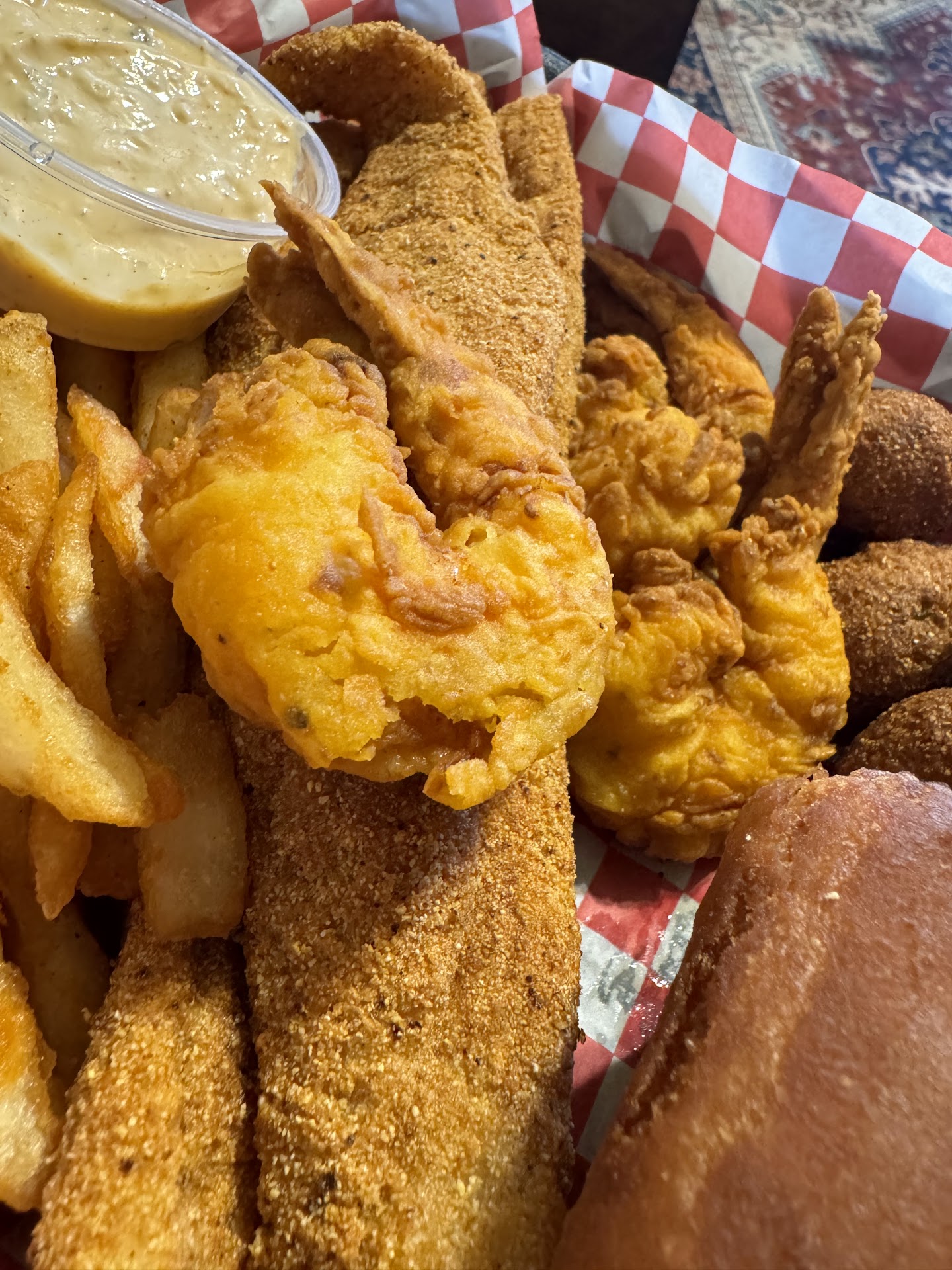 Read moreIt was kind of busy when we went in so I'm giving them credit for that. The front cashier barely spoke above a whisper, but yelled at the employees in the back. There are customers that know several foreign languages so... Here's my take: Roll is yummy, fries are okay, shrimp are huge but batter is bland, chicken strips were good. I didn't get my coleslaw so who knows if it's good. The hush puppies were not cooked through, but I think that's a fryer issue and them being impatient...