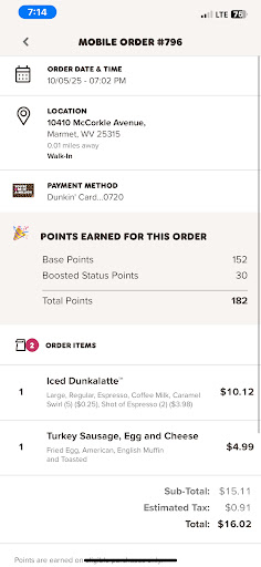 Read moreThis was my first time ever trying Dunkin and I will never go back. I mobile ordered so it would be faster but I ended up waiting inside for 30 MINUTES because even after the screen said my order was ready my food was not out. When they did give it to me, it was cold and did not taste fresh. Also, I got a chai and the worker put in 99% milk and was very rude. Terrible experience, if zero stars were possible I would do that!! This is the most disappointing $11...