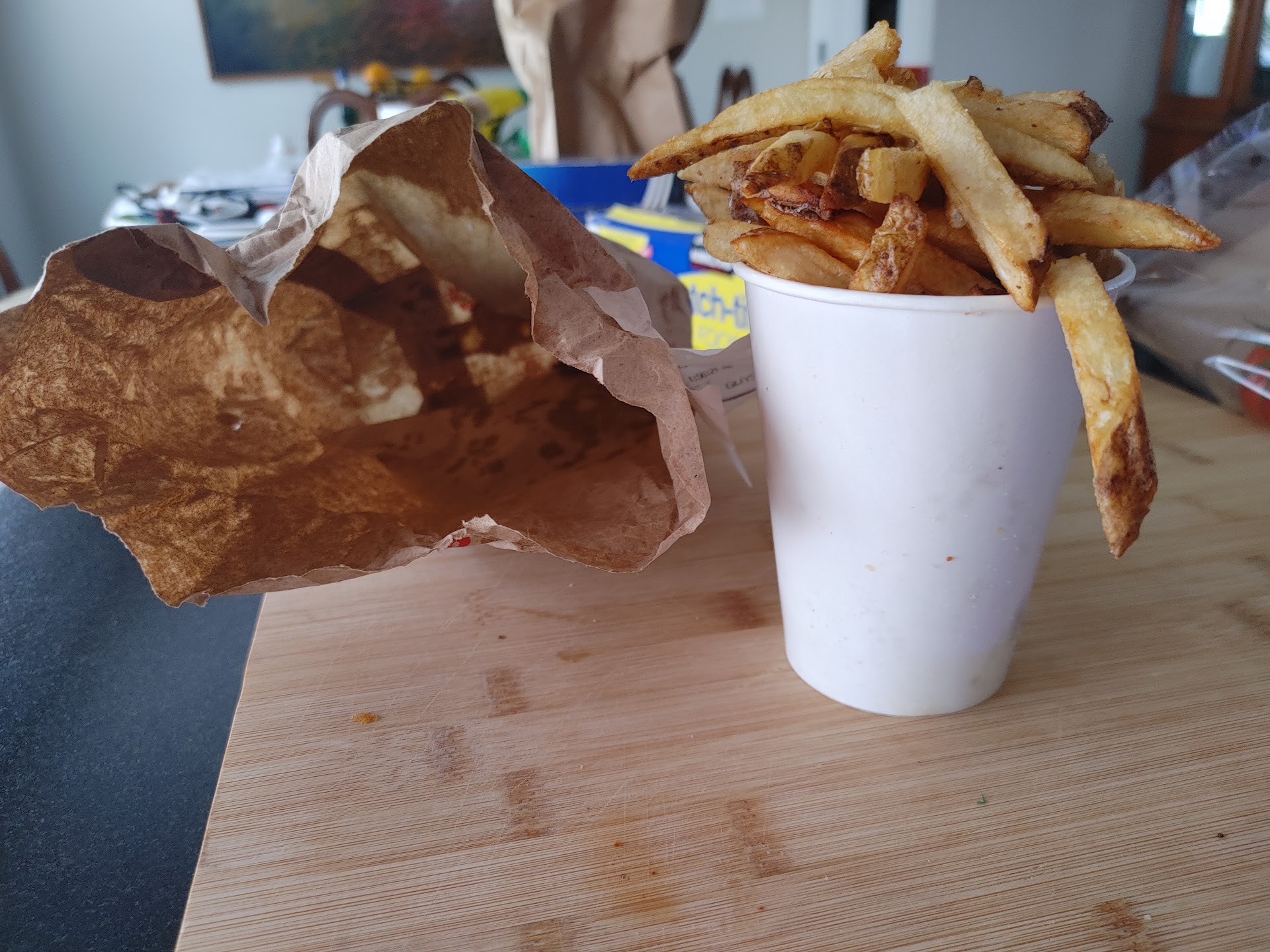 Ā Ā Ā Read moreWhen I was first introduced to this popular burger chain, it was relayed as "Five Guys Burgers and Fries". Burgers and fries are their specialty and both are equal contenders. They stock up on tons of potatoes and proudly advertise the farm/location on which they are creating the fries for that day. The best thing about ordering fries is that they scoop them into the standard fry container, place the container in a brown paper bag, and then throw another scoop into the bag. Therefore, you definitely get your money's worth. If you take the fries to-go, your bag will be see-through by the time you get back home or to work.