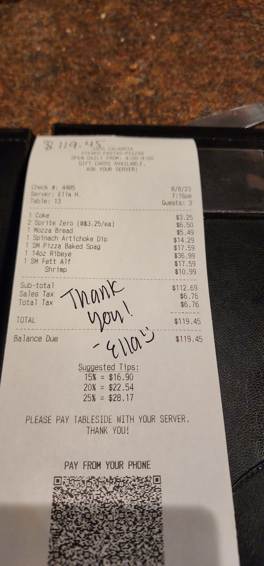 Read moreCame to the UP with my boyfriend for the first time and saw Casa Calabria was a great place to eat in Marquette, so I made a reservation in advance to ensure we would get a table during dinner time. Our reservation was for 6pm, and I will say we did show up slightly in advance (5:50pm) just to make sure we were seated in a timely fashion. When we checked in we spoke with the owner Jimmy who ensured us that we would be seated on time, they were just waiting for some guests to leave which I am completely fine with since we did arrive early. We were given one of the buzzers to wait with and were told it would only be about 5 minutes to be seated. We waited patiently from 5:50pm-6:20pm and watched multiple people be seated ahead of us despite our reservations, so I went up to check on how much longer the wait would be. I went to ask the owner on the wait time since I had checked in with him, but he shooed me away as he was socializing with other patrons at the check in desk and told me to check in with someone else which I found extremely rude. When I checked in with someone else I explained my wait time and she took me to a table that had been empty for some time. I had extremely low expectations for the rest of our service, but was pleasantly surprised by our waitress who was kind, and very attentive (very tall, long blonde hair, and I believe her name was Emma). She is the only reason I am leaving more than one star in this review as the food is only subpar and just below Olive Garden quality, not authentic by any means. I would like to add that at the end of our dinner, the owner pulled up a chair to sit with some patrons and took his mask off while sitting there talking with them... doesn’t seem appropriate as everyone else is expected to wear a mask...