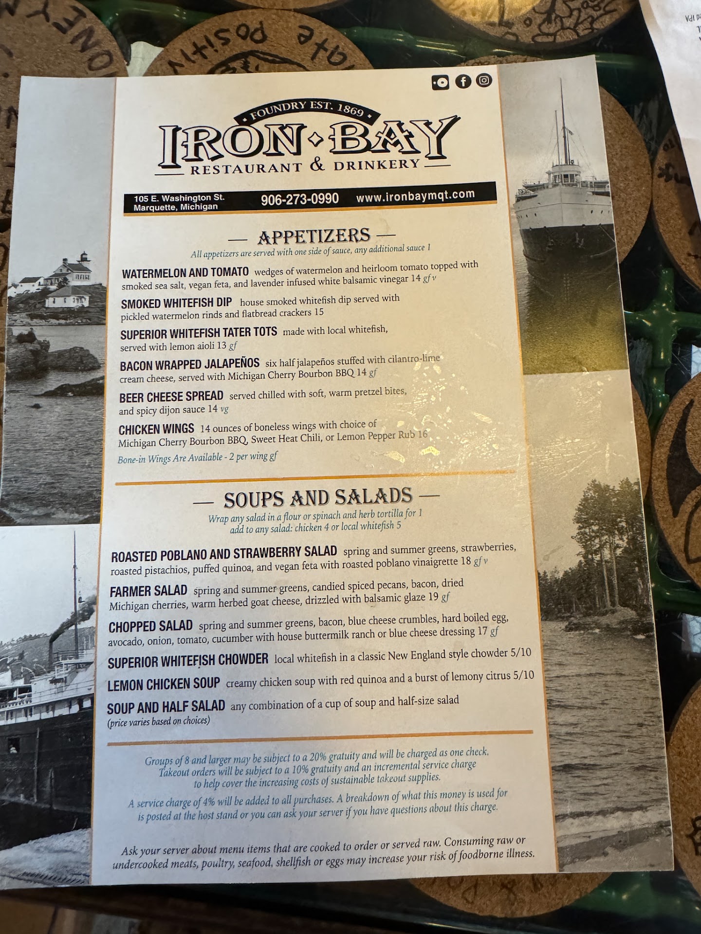 Read moreThe dear camp pie was so good it made the whole trip and the price worth it to me. My only regret is the size of the portion and I was suprised it had no sides. Luckily I didn't go hungry because my children didn't finish their boneless chicken meals. The children's portions for the money seemed like an excellent value. We got the plain chicken nuggets. Probably should have got one of the flavors instead. Really I should have got them the deer camp pie. I also had a cup of the white fish chowder. It was very good as well. Nothing can top the deer camp or though. The view was very nice and peaceful. The atmosphere was very good. My wife got the white fish and chips. Her portion was also large and seemed like a good value. She shared some with me and got a bite of my deer camp pie. She wishes she got the deer camp pie. I don't blame her. I wish I got 2 of the deer camp pies and skipped the chicken nuggets, white fish and fries. The fries were very good. Just not as good as the deer camp pie, and they didn't come with my meal. I got an I cream for dessert and shared it with the kids. The ice cream was good. My wife got a slice of goat cheese cheesecake and shared it with the kids. The ice cream was one scoop of good quality ice cream. The price of the ice cream was very good for a sit down restaurant with a view. My wife said the cheesecake was wonderful and completely worth it. The kids enjoyed the cheesecake too. The service was good. I would very much recommend coming to the Iron Bay restaurant and ordering a deer camp pie or two. The white fish soup as well. It's very enjoyable...