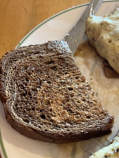 The rye toast is soggy from the omelet. And they placed two butter packets on top and over the toast. I am sure many hands have been on these packets.