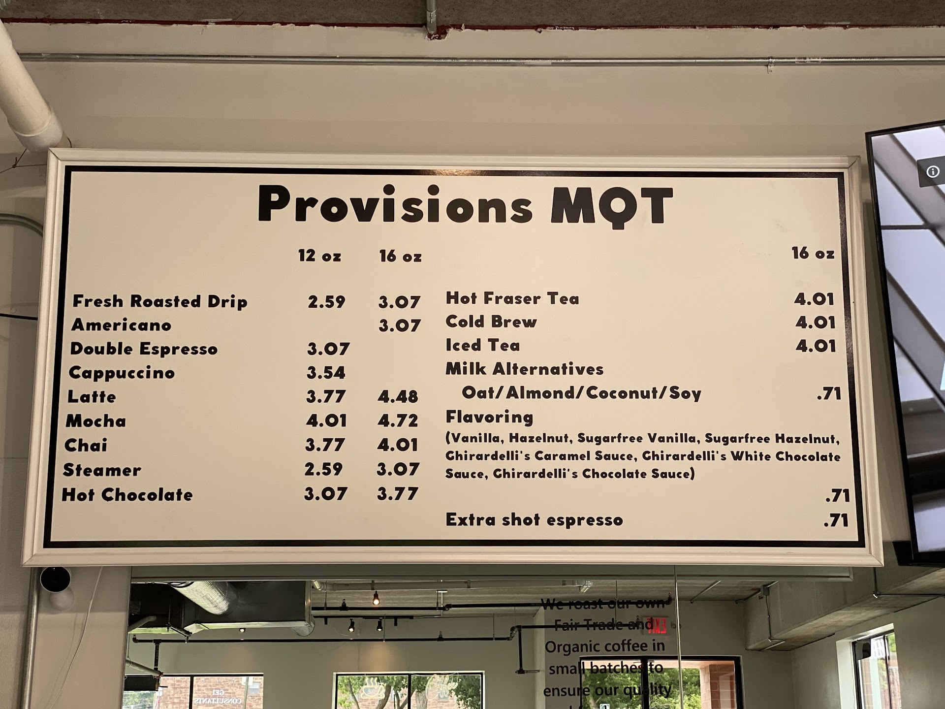 You'll enter into a welcoming atmosphere. Very clean, colorful and nice inside. The baristas are very polite and professional and every drink I have ever gotten from Provisions is top notch.
