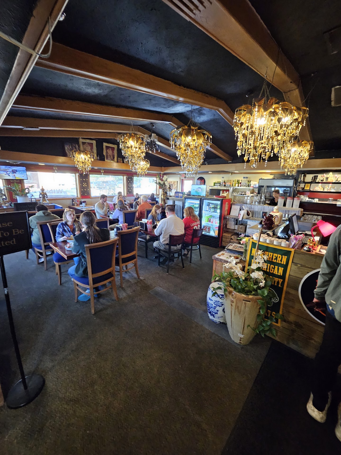 Read moreWe arrived on a busy, rainy Saturday evening, Labor Day weekend. We we're very grateful to grab the last table available. The table itself was jammed in between two others, although it wasn't as awkward as I thought it was going to be. We put in our orders for drinks, appetizers, soup and entree all at once, not realizing they would come out all at once, except for two cocktails that didn't arrive until the end of the meal. They hadn't delivered the silverware or all the waters before the food came out. It also was hard to get the attention of the wait staff to ask for our drinks. I ordered the Pad See Ew with shrimp, and a Tom Yum Soup. The soup was swell with the exception of the one under ripe cherry tomato floating in it. The noodles we're good as well, and the shrimp tasted fresh. My husband got the Drunken Noodle with duck. It contained maybe smallish 5 pieces of duck, but tasted good. My kids got eggrolls and tofu Pad Thai. They complained the Pad Thai was too sweet. Too sweet for a kid? I didn't believe it until I tasted it. It wasn't like any Pad Thai I had ever had. It was very sweet and quite red in color. No one in the family found it all that appetizing.. I'd have to say if you hit them on a good night maybe Thai House would be excellent, but too many things we're off for us to call it a good experience. The clincher was when my husband questioned the $19 for the Drunken Noodle with duck as it was stated as 16.95, and they just basically said "Oops, we forgot to update the price on the menu". Yeah it is just $2, but uncool. You can't...