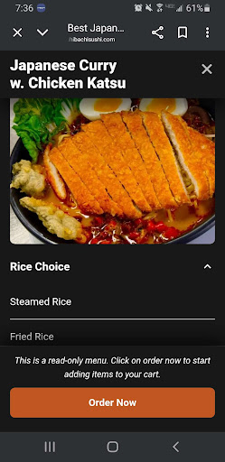Read moreMy wife used the online menu ordering through beyondmenu.com, which at the time of ordering included the chicken katsu entree, there was two version of the meal, one of them being the chicken katsu ramen. This, along with another entree were ordered. When I picked up the order the received Katsu was the non-ramen menu item. My wife went back into the store to simply explain the situation and refund the order, after some argument and confusion(which was about the item not being orderable online, picture of the this very item being on the menu included), they did refund the price of the mistakenly ordered meal, $22.35. They did not refund the returned fried rice, $1.00, nor the tax due on the returned portion of the order, $1.84.