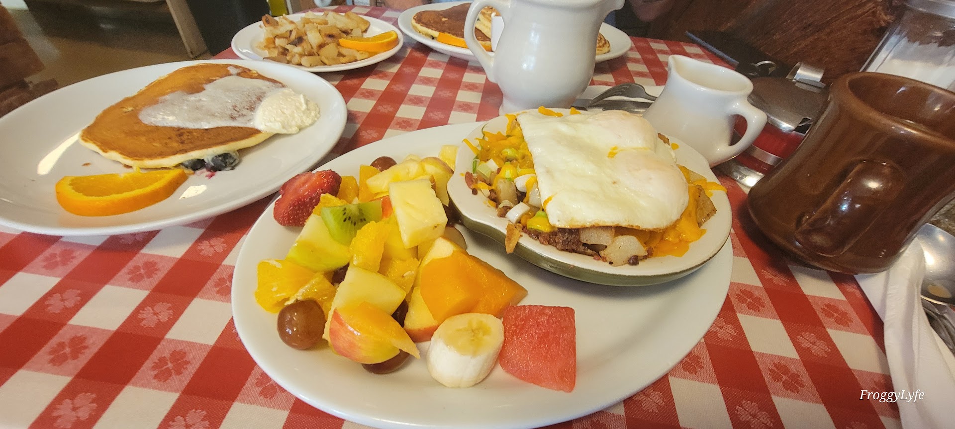 I got the skillet with eggs & bacon with fresh fruit & a blueberry pancake. Hubs got 3 blueberry pancakes & side of breakfast potatoes. We were stuffed!