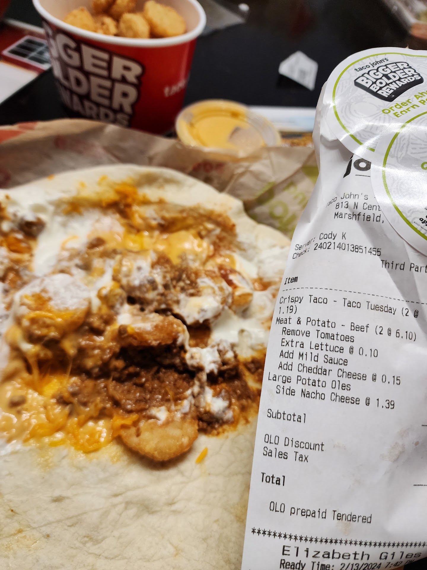 The food itself is slop. It's really bad. I was excited when I first moved to Wisconsin because of how much people talked Taco John's up over Taco Bell and Del Taco. I genuinely do not know what the hell is wrong with those people. The food is always cold, always bland to the point of being disgusting, and sometimes even missing ingredients. My absolute worst experience with it was ordering a breakfast burrito and getting cold, rubbery eggs on a soggy tortilla with the meat missing and so much pickled jalapeno that it was the only thing the burrito tasted like. The food is also thrown in there in a complete mess, which it's at least slightly better about than the typical Taco Bell. That's about the only positive I can think of, mind you.