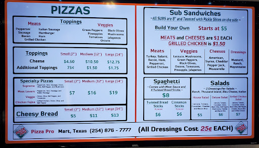Worst experience EVER!!! Pizza is edible, but if you make the mistake of ordering over the phone & expecting the “online menu “ to be followed you will be sadly mistaken!!! After arriving to pickup my order & discovering it to be nowhere close to what I thought I had ordered I was repeatedly told by an older man that they don’t have an online menu...I then asked why a menu comes up & says its for Pizza Pro in Mart... I definitely will be emailing the franchise & filing a complaint! When you order a MEAT LOVERS & say no sausage& add bacon...you expect to get hamburger, pepperoni, ham & bacon...or that’s what I expected!!! Absolutely DID NOT get what I ordered! And don’t expect the extra cheese that the online menu stated....you’re barely going to get cheese at all!!! Also the Supreme didn’t come with hamburger either???? How is that a supreme???? Skimpy toppings!!! Very very disappointed!!! And apparently in Mart the customer is not...