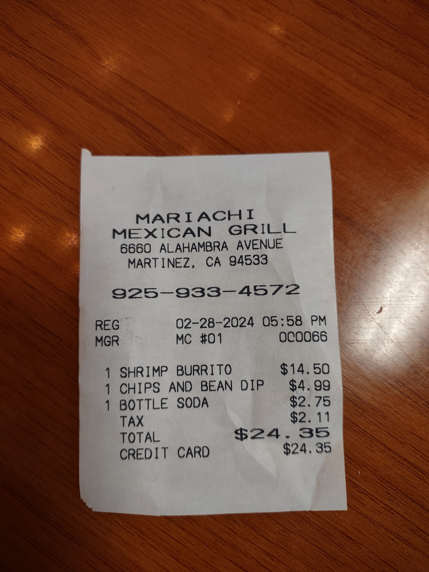 Read moreI ordered a super shrimp burrito 🌯. It tasted good, it was heavy on rice and beans but light on shrimp... 🤦 They now charge for chips.. 😲💰💰 I don't think they used to..