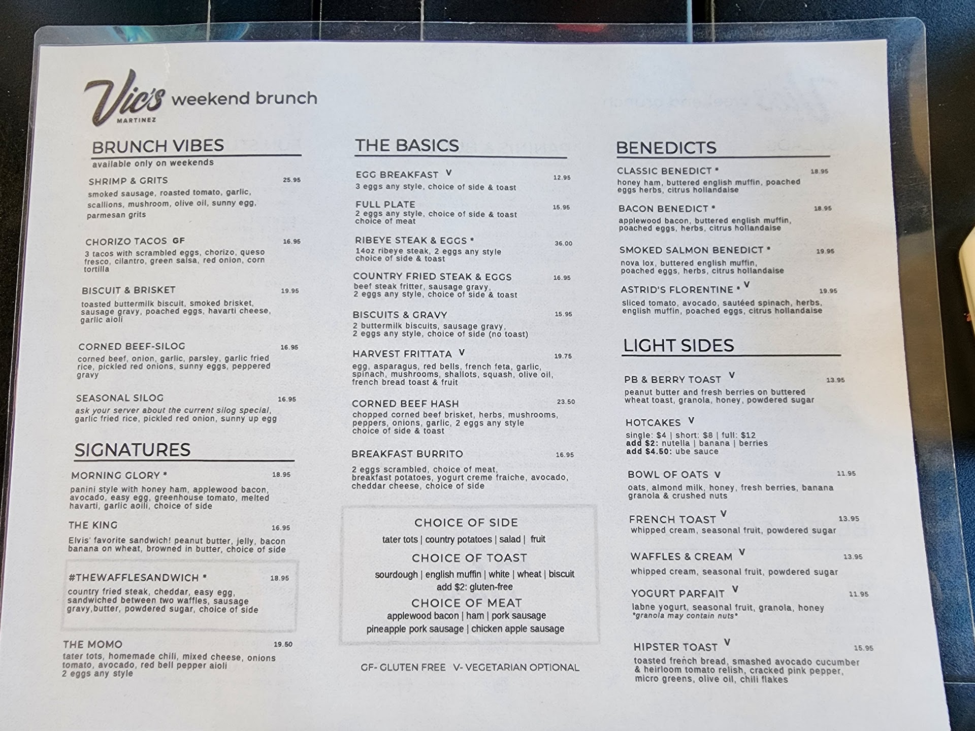 Read more5 min wait confirmed, drink order placed within 1 minute of sitting down, placed food order within 1 minute of drink order which is outstanding. I tried the #The Waffle Sandwich which has been reviewed several times on Yelp. At first I was skeptical, however the mixture of flavors were great. Most things taste amazing with butter and syrup so do not spread the butter over everything and drench it in syrup the first time you try it but take your first bite without the butter and syrup. With my first bite I realized that the intricate mixes of waffle, gravy, easy egg, and cheddar compliment each other very well. I take another bite but this time I only add the butter and it becomes a bit saltier. Now I add the syrup and the dish is now realized as it should be, comfort food at it's best. I ordered taters as my side supposing it was a potatoe cake or something of the like, it was tater tots which was an unexpected suprize. I received my meal in less than 20 minutes from ordering and considering how busy this establishment was that is stellar. My only criticisms are the water and the gravy. The water needs to be filtered, nowadays most establishments offer bottled water for a fee but how difficult is it to install a filter. The smell alone made me stop drinking the water and I drank coffee for the entire meal. Last but most important was the gravy, it was overpowered by the sausage flavor and was hard to distinguish the gravy from the sausage in any bite. These two items dropped the review from 5 to 4 stars but don't let that deter you from going to Vic's. I rarely publish a review and the few reviews I publish are for places that are great, and places that are disgusting. Vic's is great and I look forward to trying other items on the menu in the...
