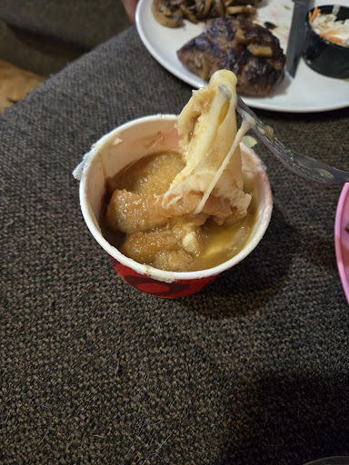 Please explain to me what this is?? We did order to be picked up and I was suppose to have received garlic mashed potatoes with my steak and sautéed garlic mushrooms. The mushrooms were cold and steak over done.. I can deal with that. I can even deal with my cheesy broccoli being glued together and cold themselves.. but for the life of me I can not figure out what this is suppose to be. There are big chucks of what looks to be fried apples.. but it smells like potatoes and gravy🤮🤮 This is DISCUSTING Martinsburg Apple Bees.! No excuses for it! DO BETTER!