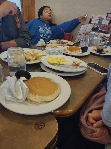 Read moreCame in for a late breakfast and had the honor of sitting at the counter. I love eating at the counter because you get a show with your meal. Today was no exception. The plot of today's show revolved around the pre-church, post-hotel-checkout rush... a sort of prelude to an even more epic event to come that I would gladly miss. Though while I sit in the parking lot, inspired to share my experience, I am witnessing the tide of families coming to eat and my thoughts are with the cast for their upcoming performance. Leading the brigade of dedicated servers and cooks was a seemingly kind lady in a pink sweater and a headset. I still don't understand the headset but she wore it well. She greeted everyone, myself included. She genuinely cheered on the staff around her. I assume she was a manager or shift leader or perhaps their mother. Like a mother she was quick to invite the cooperation of her little family and also to get her own hands dirty. She gave me my first cup of coffee (thank you, Lori was it?) My server was attentive, and checked on me often enough to insure I was content. She was gracious with her time, especially to a man who has eaten from this menu dozens of times in other locations and yet continues to struggle with his desire... breakfast or lunch? Hotcakes and eggs or pot roast and that cheddar potato soup (the recipe to which forged from some out-worldly miracle witchcraft)? I watched another server, in the midst of the organized chaos take a particular interest into a costumer I will assume was at least a regular if not a dear friend. He was also at the counter. What was most impressive was that everyone called him by his first name... Jim, I believe it was. The scene between this man and the rest of the staff was a favorite for me and had me almost jealous of his ability to frequent this place enough to have earned such a following. And mind you, at the counter you hear everything... comments, jokes, gripes and praises. He said hi to everyone that crossed his path and they in turn greeted him warmly like an uncle that doesn't visit often enough. Not a negative tone in the bunch save a brief moment between a cook and server over the age-old debate of whether or not this order of hotcakes was supposed to have strawberries. Brilliantly performed and even more brilliantly resolved with an understanding of disgreement and a few modestly flung strawberry pieces. Hilarious! I should point out that nothing about this exchange was tense or awkward... more proof of the cast's cohesive whole. People moving everywhere, offering to help one another, finding things to do behind the scenes to make the future a bit more smooth. Executed majestically. To me, a diner experience is one of the last true observable moments in the world around us. One of the few ways you can quickly surmise the fate of a society... and I left encouraged. In these wonderful moments they were busy, stressful, sweaty... and kind. And all of them moving far too quickly for anyone to acknowledge those moments for the beauty they possessed and the hope they inspired. Corporate blah blah blah... I get it's not a small business and there are other diners in the world with just as much America in them. But as with so many things these days... it's the people that matter. People work in chains too. Eat where you like. If you're near this one though, eat here. My food was cooked as expected, tasted like what I wanted and was thoroughly enjoyed. I recommend this place... the counter at least, to anyone considering the state of the world, or at least their place in it. Come see a group of people working hard to do a tough job for oblivious hungry people and see them do it gracefully and with heart. Order the hotcakes too... with or without...
