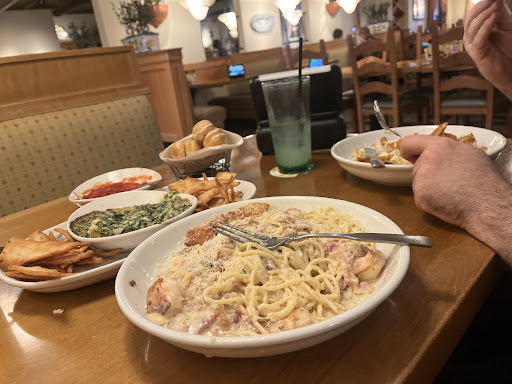Read moreFrom sitting at the bar while waiting for a table, and the dining area after being seated, our experience at this particular Olive Garden was phenomenal! The wait wasn’t more than 20 minutes on this Saturday night around 7 p.m. The two hostesses were very kind and all smiles. My wife and I proceeded to the bar. After a couple of minutes the bartender assured us that he would take of us. We understood. A young lady came to the counter and politely asked if she could help us. She made an awesome mixed drink for my wife and a poured a cold draft beer for myself. A couple of minutes later we were called for our table. We received the text to proceed to the hostess area for us to be shown to our table. Our server was Donna. She was a true professional. Polite, attentive, and accommodative. Our meal was excellent. We ordered the Spinach and Artichoke dip with Pita Chips. It took longer than expected, yet the server assured us that it would be out as soon as possible. We didn’t mind. It was good, but nothing to cheer about. We were served the salad, bread sticks, and my soup. I forgot what the soup was called, it had the sausage and potatoes in it. Not much is in it, yet the flavor is very good. The salad comes in a big bowl. It was fresh and with the right amount of dressing. The bread sticks are to die for. Be sure to ask for the side of Alfredo Sauce to dip your bread sticks!! OMG! What a great combination! My wife had the Chicken Alfredo and I had the Seafood Alfredo. We were asked if we wanted more Alfredo Sauce to add to our meal, YES PLEASE. Not that it was dry, but just a hint more of it completed our fabulous meal. We ordered the Tiramisu to take with us. There was so much food throughout our dinner there! We live in Austin, Texas and quite frankly, the service and atmosphere here , in my opinion, was far better than an Olive Garden we visited in Austin. The entire staff were outstanding!!! Thank you for our awesome...