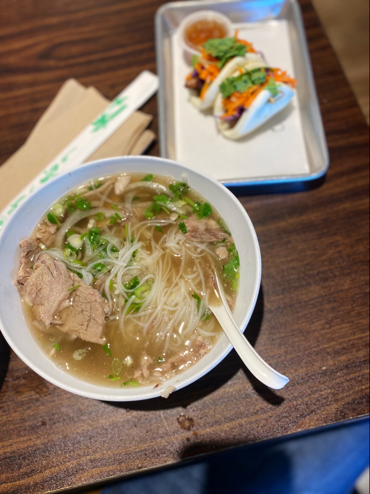 We also got the brisket and meatball beef pho, expecting both. Instead, we got no brisket, but eye of round, and hardly any of that. Also, only one tiny piece of lime, no jalapenos, and hardly any basil in the garnish were provided. Terrible. Again, wish I had called to complain.