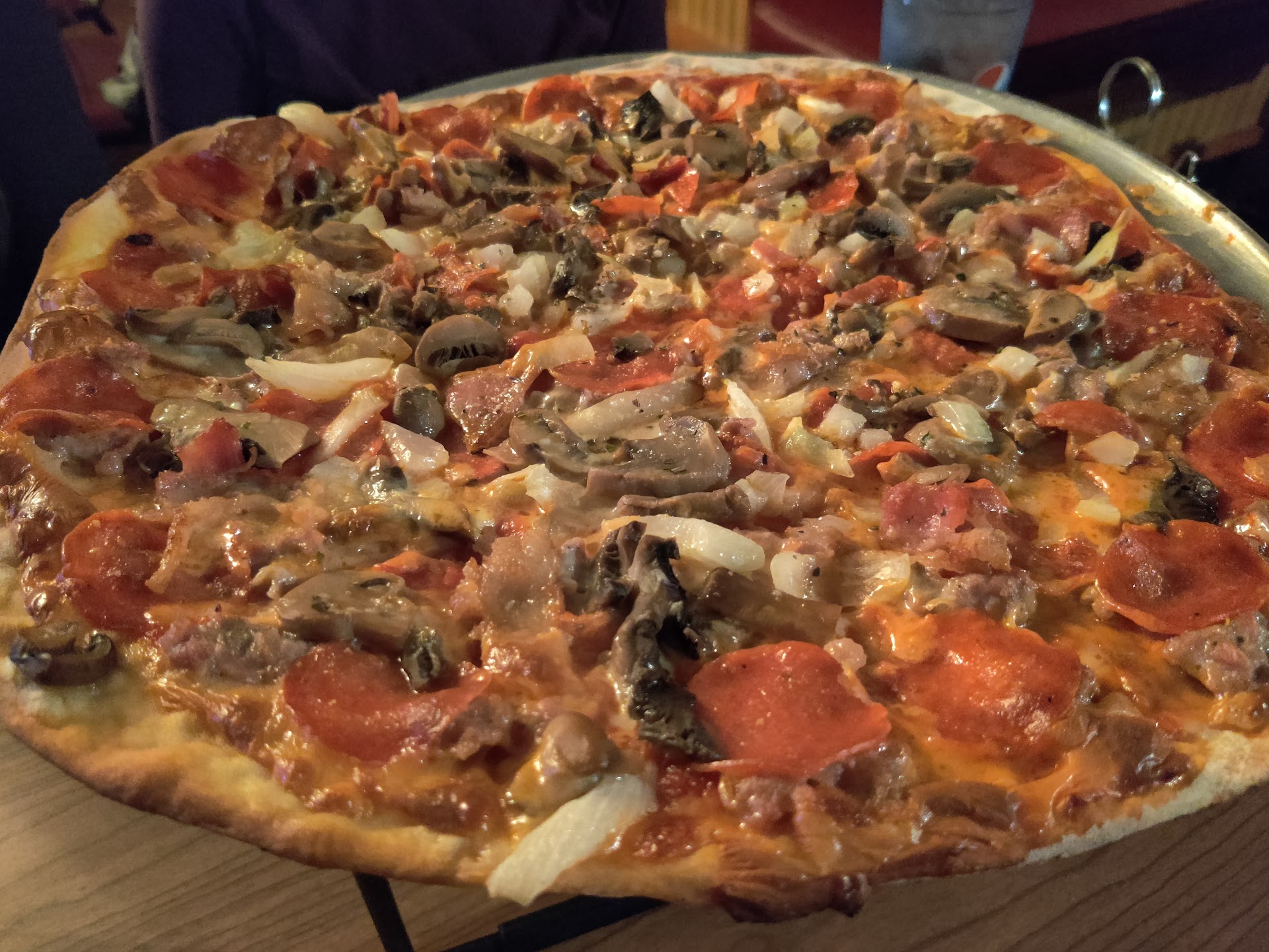Service: This is the hard part. There was a big crowd in the back so the waitress told us an hour for pizza. We were willing to wait and figured salad and appetizer would hold us over. an hour and half later we got the salad and mozzarella sticks. Another 20 min later we got the pizza. One friend ordered pasta and he got that before the rest of the food. Note.. we didn't complain, we didn't waive down our waitress, but we saw two other tables who were sat after us (a good 30 min) get pizza before us. Think the waitress knew them so maybe that was in their favor but if I hadn't really wanted this pizza would have walked.