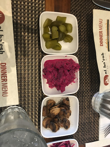 After you place your order, they will deliver the "Al Ha'esh Experience". This is a plate of some of the best freshly-made pita bread I've had anywhere, accompanied by a selection of pickled vegetables and salads. The number of salads you get on a given evening will vary, presumably based on whatever they have in the kitchen that night. The menu says "a dozen or so," but in reality it tends to range from 8-10. No matter, as they will all be fresh and tasty and they will bring more of them to you upon request if you want.