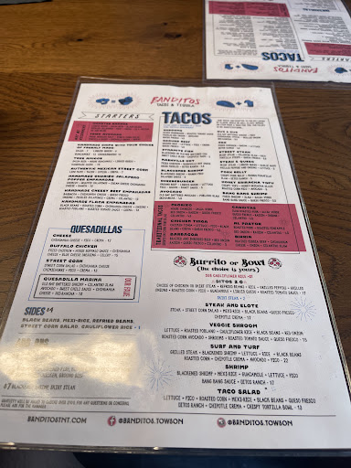 Ā Ā Ā Read moreRight in the heart of the towson food scene, banditos gives the college/ sports bar vibe with colorful decor, hip music and laid back atmosphere. They not only offer the famous Taco Tuesday night but several other happy hour deals and specials, which sets them apart from many other local taco spots. I opted to sit at the bar but there are several options and a great open space. The crowd was decent and not too busy for a Tuesday evening , so I was a bit taking back by the sort of slow service I received once I sat down. The server passed by me twice without asking if I needed anything but once I caught her eye she sensed I was ready.