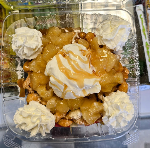 I love to go here on a regular basis (3 times this week alone), but today I had a new experience and wanted to share. The atmosphere is always a breath of fresh air. The staff is never less the amazingly pleasant. My only complaint is the false advertising, or rather lack of warning I received when I ordered... the apple harvest funnel cake. It's right on the board, plain and simple... very unassuming. I thought, well, it's just funnel cake....I'll order a kiddie butter pecan also.... well, please see the attached photo for the reason I post this message...all will be understood. It is recommended to eat it there and don't take it to go, but either way, it's...