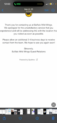 Whether this is a franchise or private owned entity, Buffalo Wild wings should be quite concerned with this type of deplorable customer service being rendered under their Brand.